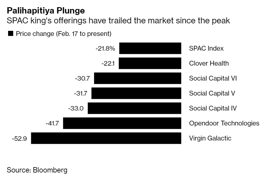All six of Palihapitiya’s Social Capital Hedosophia-linked blank-check companies, including three that already completed mergers, have plunged more than the broader SPAC market since it hit its peak in mid-February. One of them — Virgin Galactic Holdings Inc., a space tourism business that’s backed by Richard Branson — is down more than 50%. All of these losses are greater than the 23% average decline in SPACs, as measured by the IPOX SPAC Index, over that time.