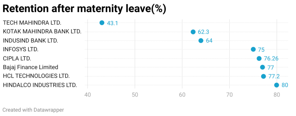 Data compiled by The Bottomline reveals that in a fifth of these companies, the percentage of women going back to work ranges from 90 to 99. All women remain in the job for over two years after childbirth in over 58 per cent of the companies analysed. While these numbers may reflect a positive picture, it must be remembered that women in formal employment are less than 1 percent of the Indian population.