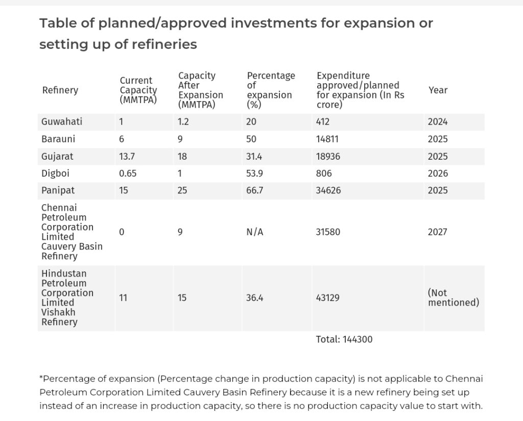 The Ministry proposed a Rs.1,44,300 crore ($17 billion) investment to expand national oil refineries, which goes against the grain of the government’s intention to seek higher investments in renewable energy.