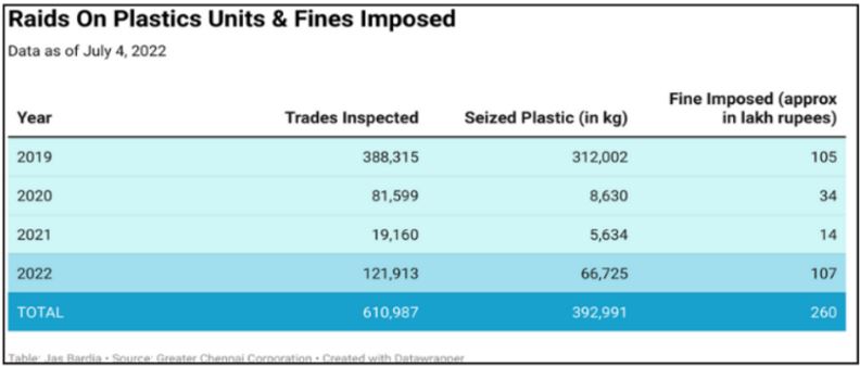 Greater Chennai Corporation (GCC) collected the most fines in the last four years from plastic ban violators in the first seven months of 2022. The Chennai corporation collected fines worth ₹1.07 crore from sellers of banned single-use plastics. It also confiscated 66,725 kg of plastics worth ₹1 crore, from 1.2 lakh raids in those seven months.