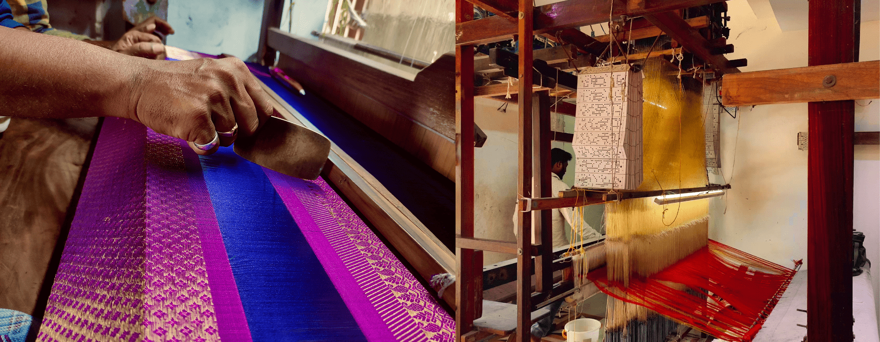 Organizations like the Kamatchi Amman Kooturavu Society provides support to weavers, while the Anna Society focuses on thread production. Each saree takes about 15 days to produce, and Kannadasan often bears the costs himself due to limited access to loans or external assistance.