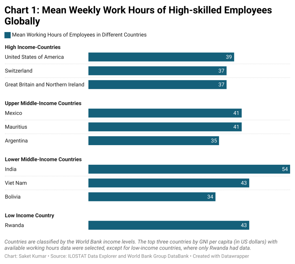 Chart 1 shows that high-skilled employees in India (a lower middle-income country) work for longer hours than their counterparts in high-income (USA), upper-middle-income (Argentina), lower-middle-income (Vietnam), and even low-income countries like Rwanda.