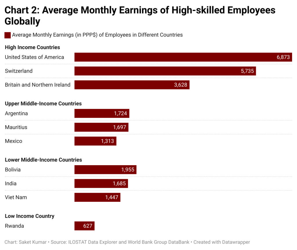 Chart 2 illustrates that high-skilled employees in India earn an average of $1,685 per month. This amount is only a quarter of what their counterparts make in high-income nations such as the United States, a third of the earnings in Switzerland, and half of those in Britain.