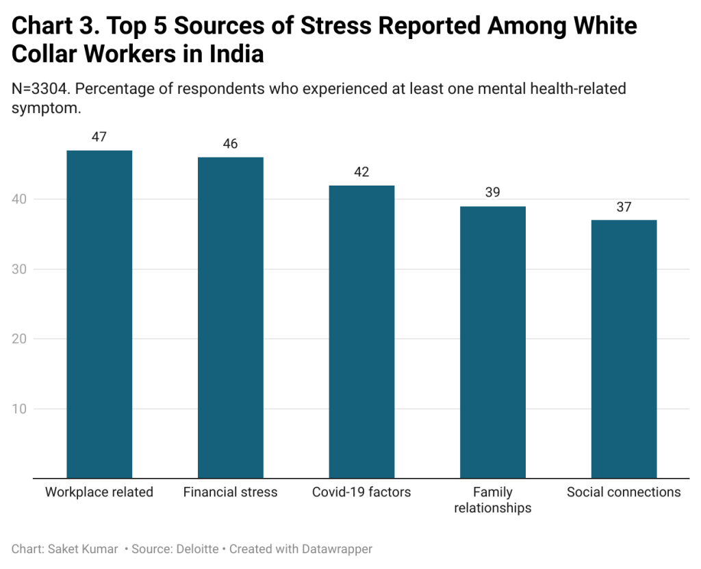 A 2022 study by Deloitte on Mental Health and Well-being in the Workplace found the workplace to be the top stressor among white-collar workers. Out of 3304 workers surveyed, 47 percent of respondents reported experiencing workplace-related stress. At the same time, 46 percent complained of stress due to financial issues. (See Chart 3 below).